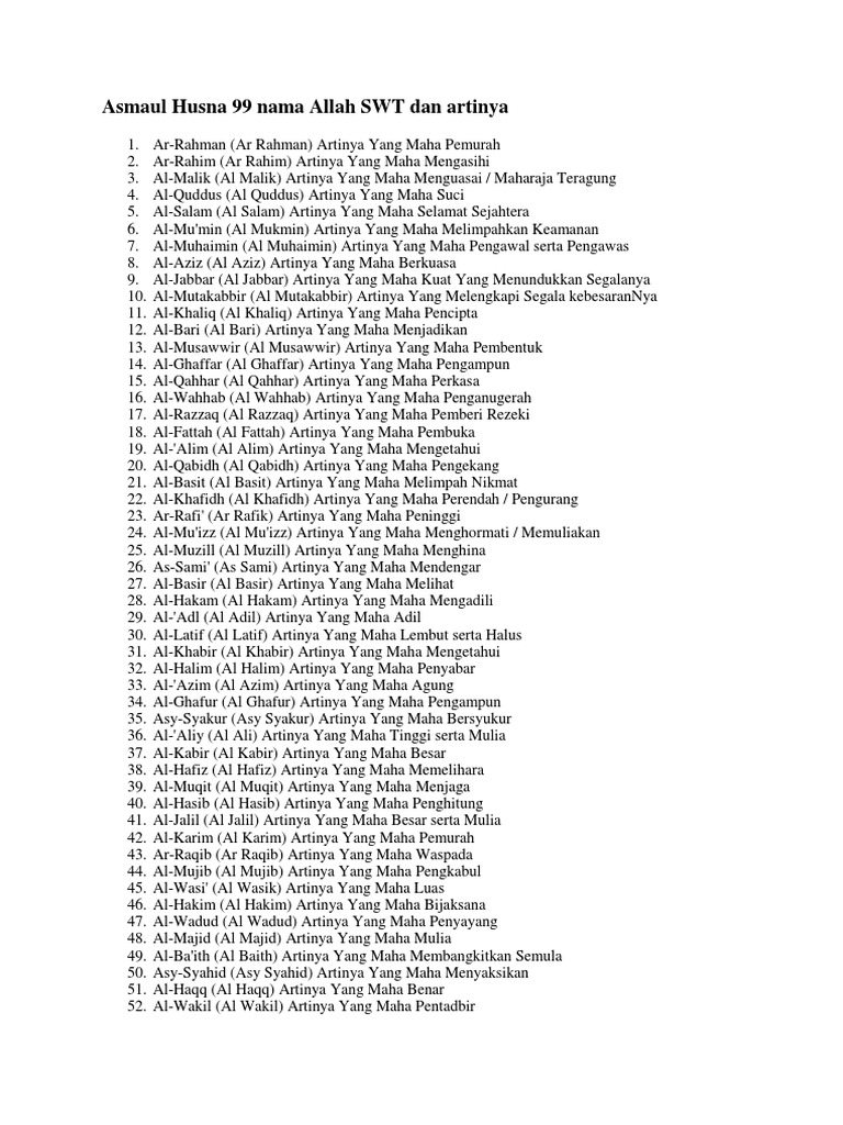 Biasanya asmaul husna dalam bahasa inggris memakai kata berbeda namun memiliki makna hampir serupa dalam bahasa indonesia. Istilah asmaul husna juga dikemukakan oleh allah swt dalam surat thaha:8 yang artinya: Nadhom sendiri menurut bahasa mempunyai arti syair atau pantun. Asmaul husna bisa dibaca ketika selesai shalat atau dibaca di saat tertentu. Selain mendapatkan pahala, kamu akan mengetahui kebesaran dan kekuasaan allah swt.